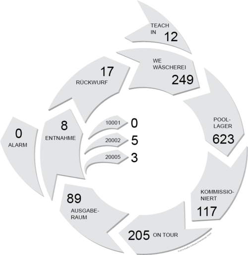 Das iWAS-Dashboard ist eine Browseranwendung und bietet dem Benutzer u.a. eine Live-Übersicht über den aktuellen Stand der Buchungen an allen Buchungsorten. Über die grafisch angelegte Oberfläche können Bestände sofort überblickt und Details auf Buchungsorts- und GTIN1-Ebene mit einem Mausklick zugeschaltet werden.